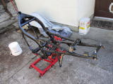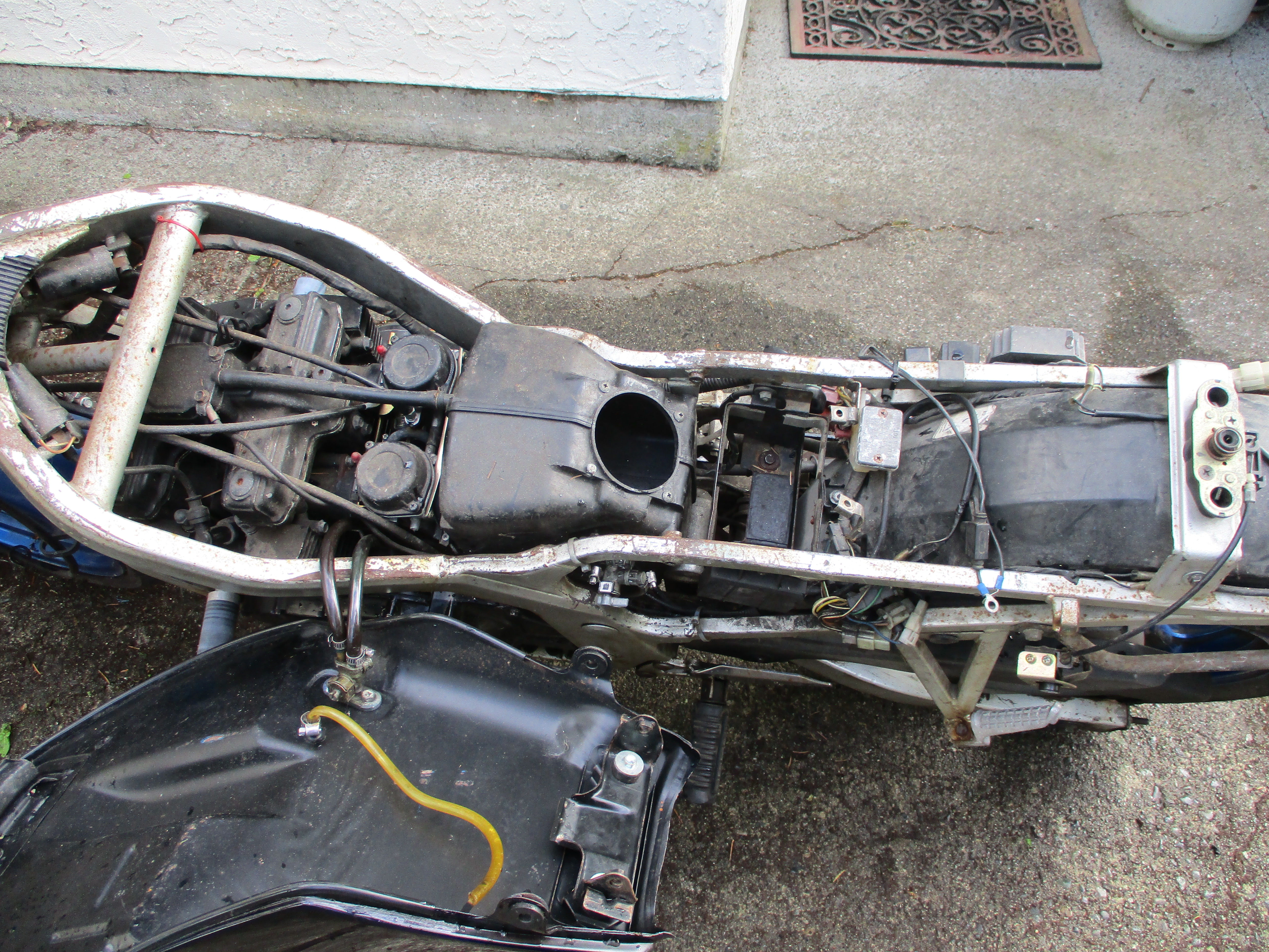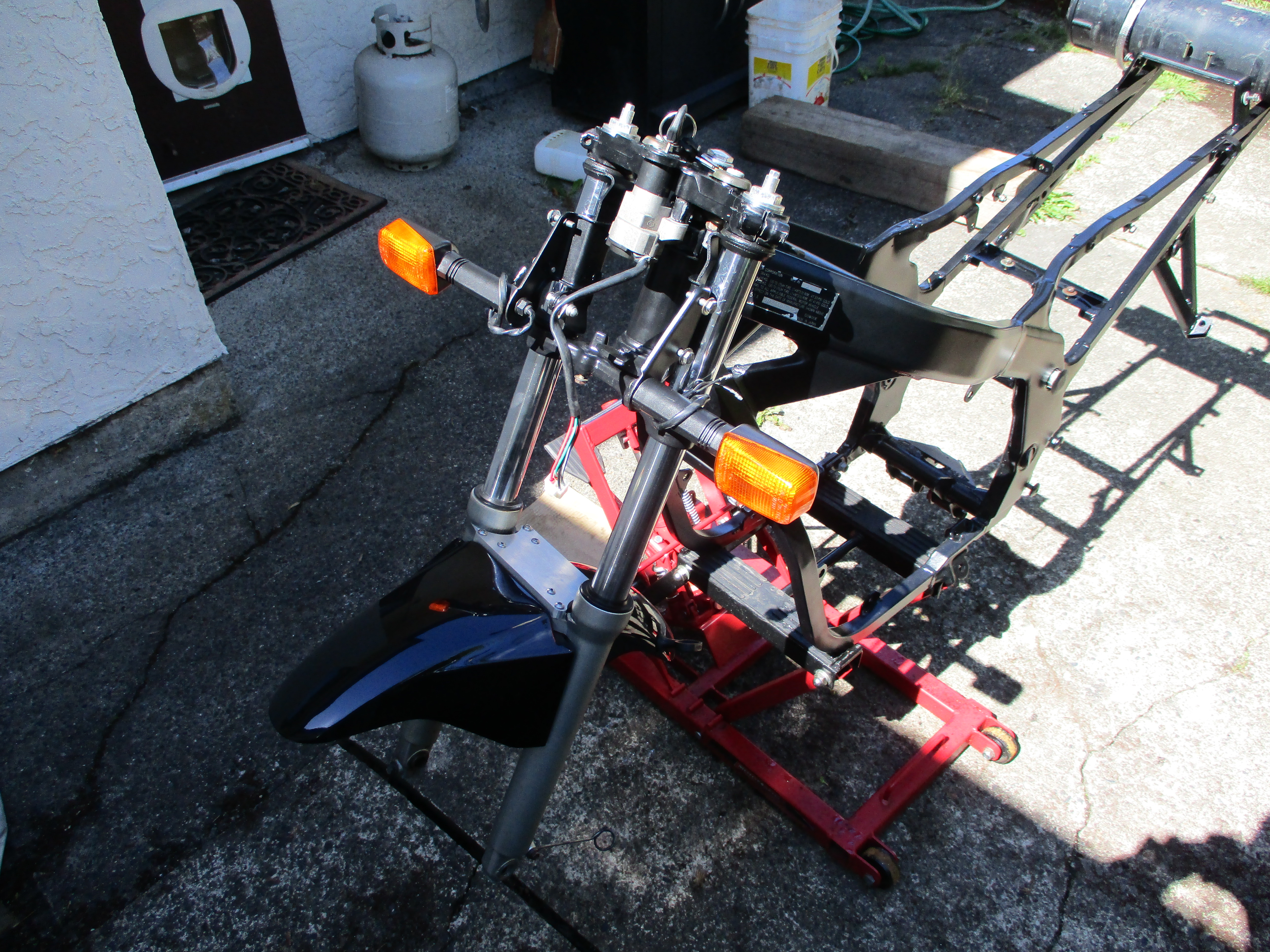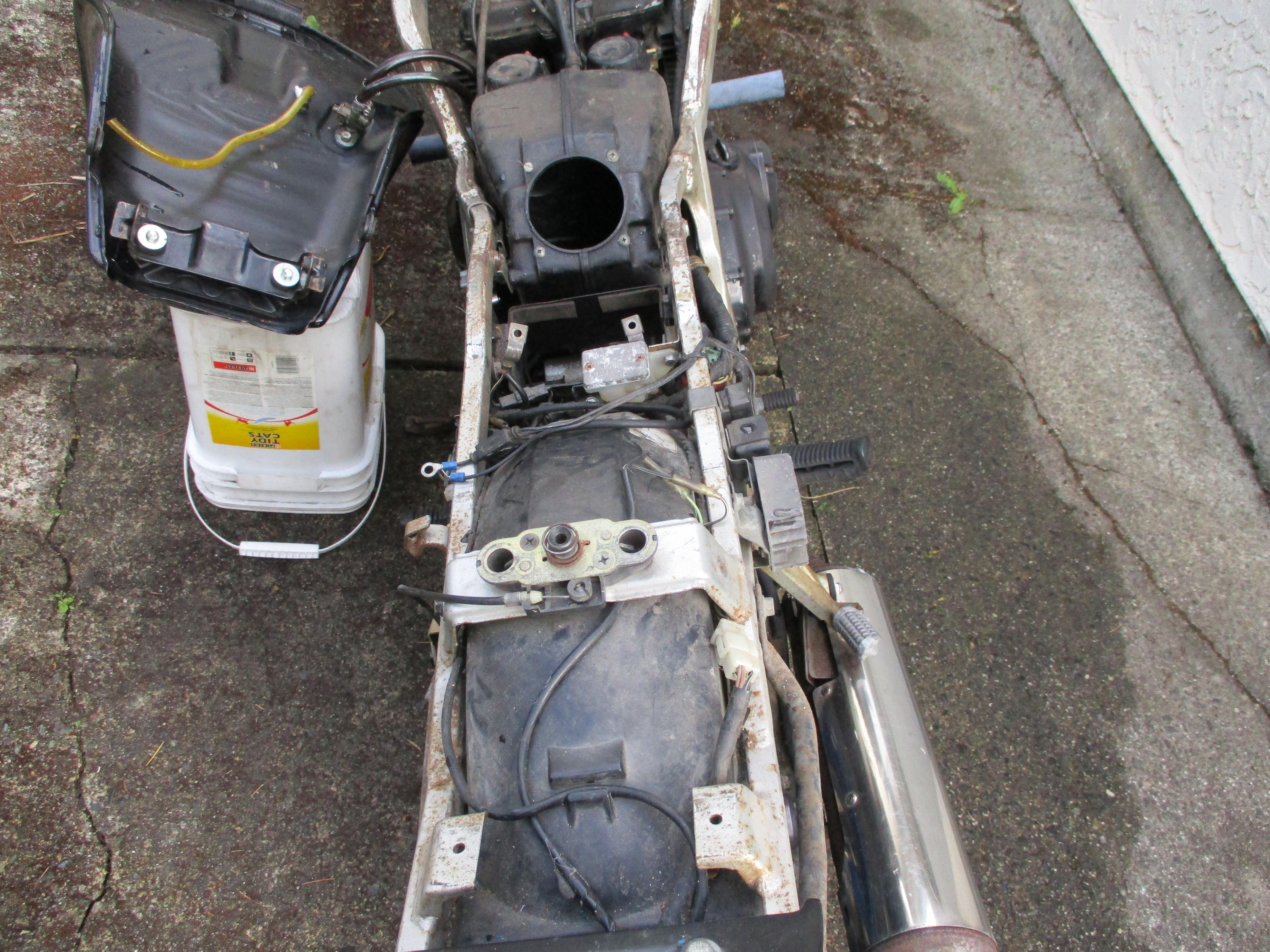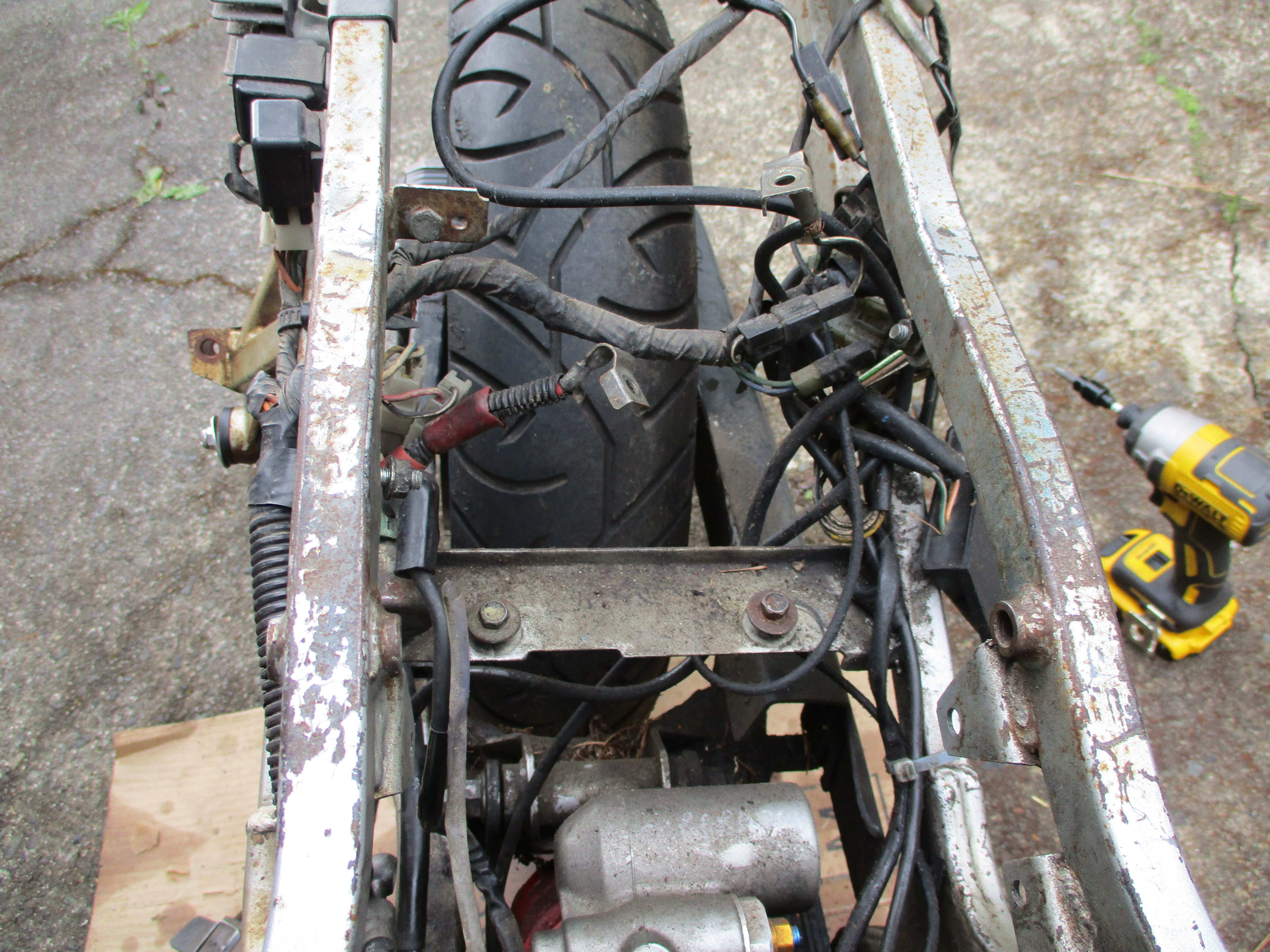 Next I removed the engine, front wheel and forks. Then the bottom triple tree/steering stem and then the entire headlight/gauge top triple tree assembly with the main wiring harness still connected to it. And then the rear wheel, swingarm, and rear suspension.
