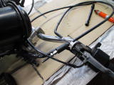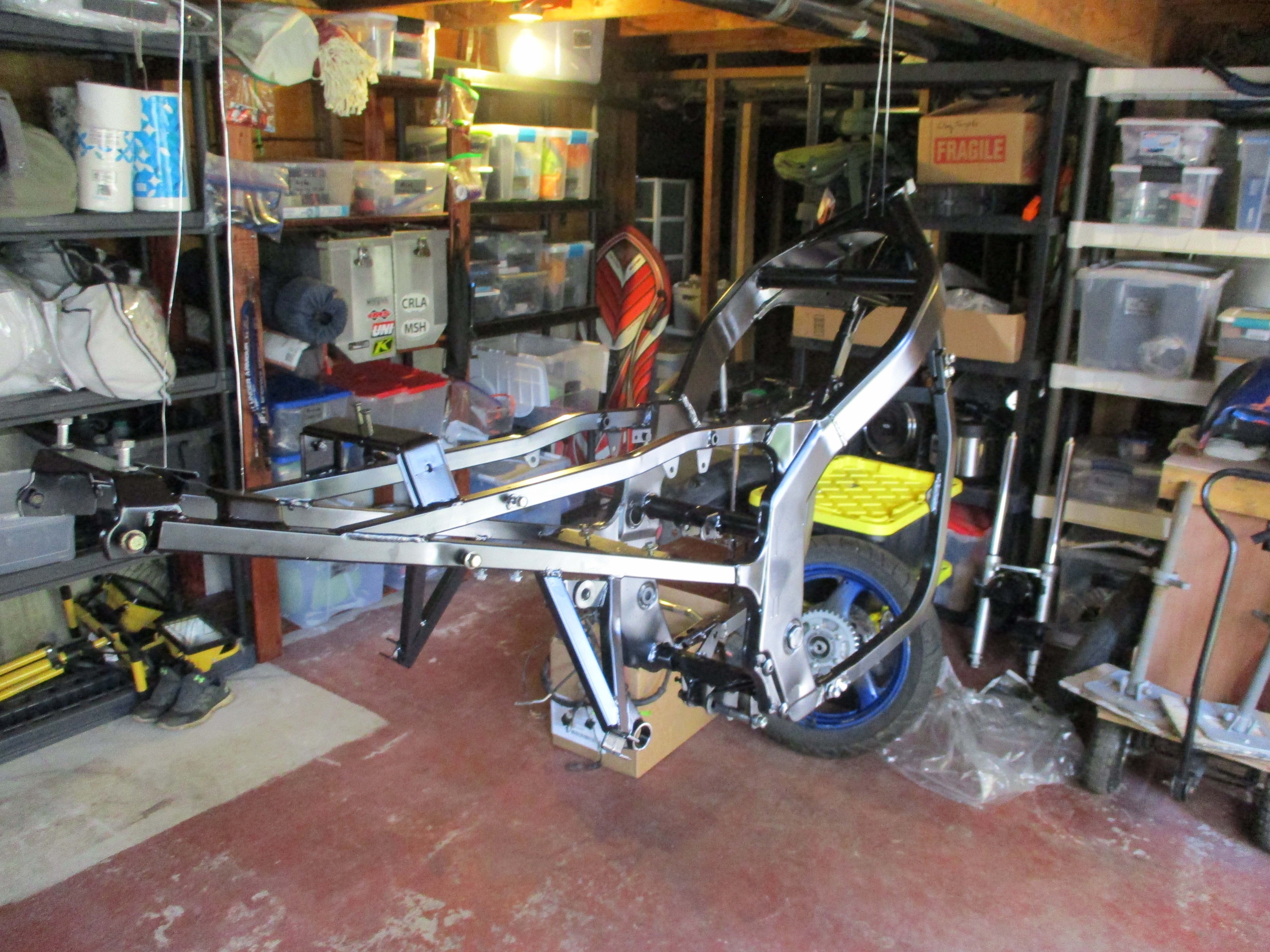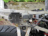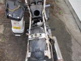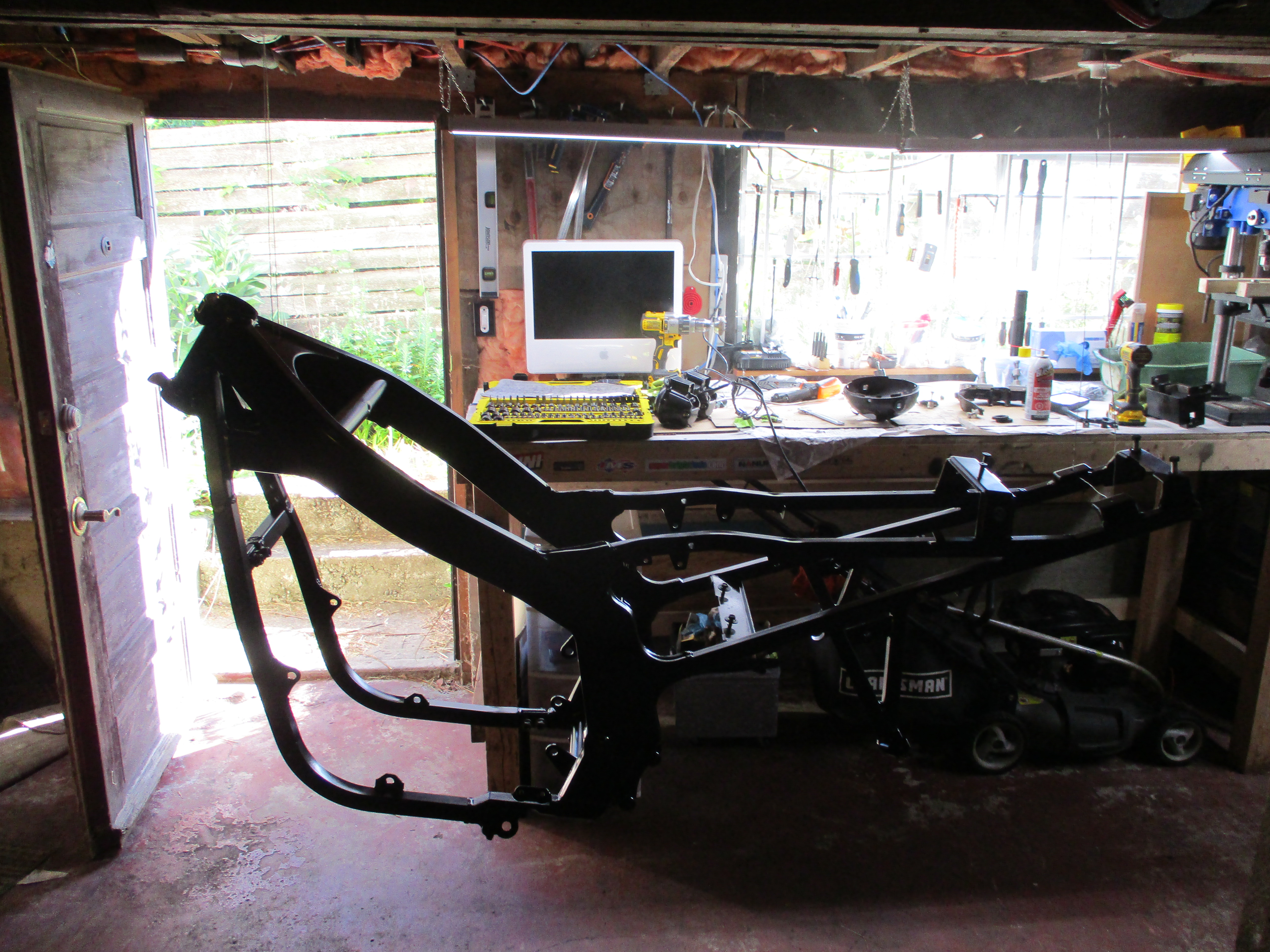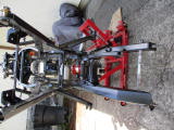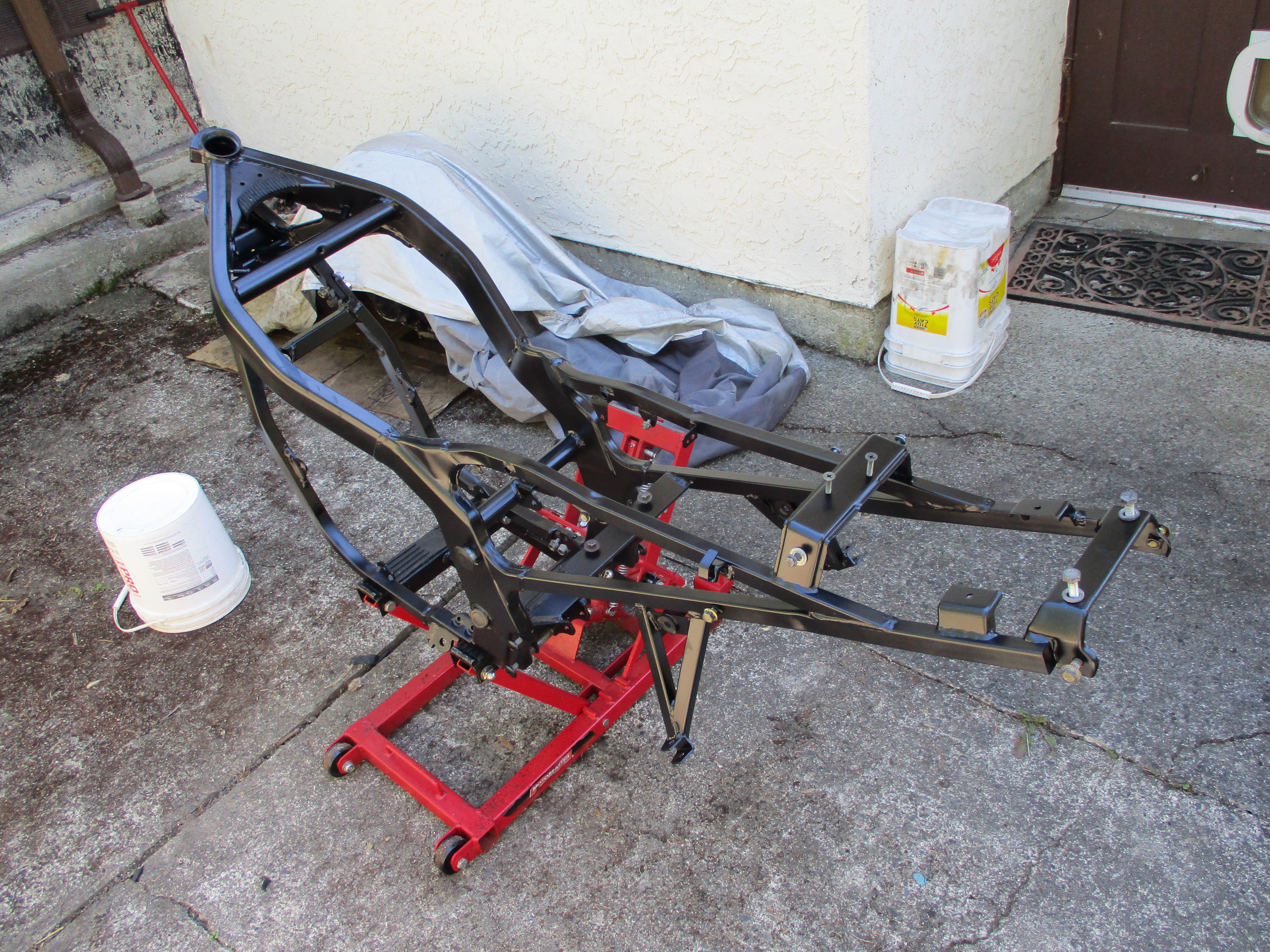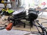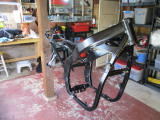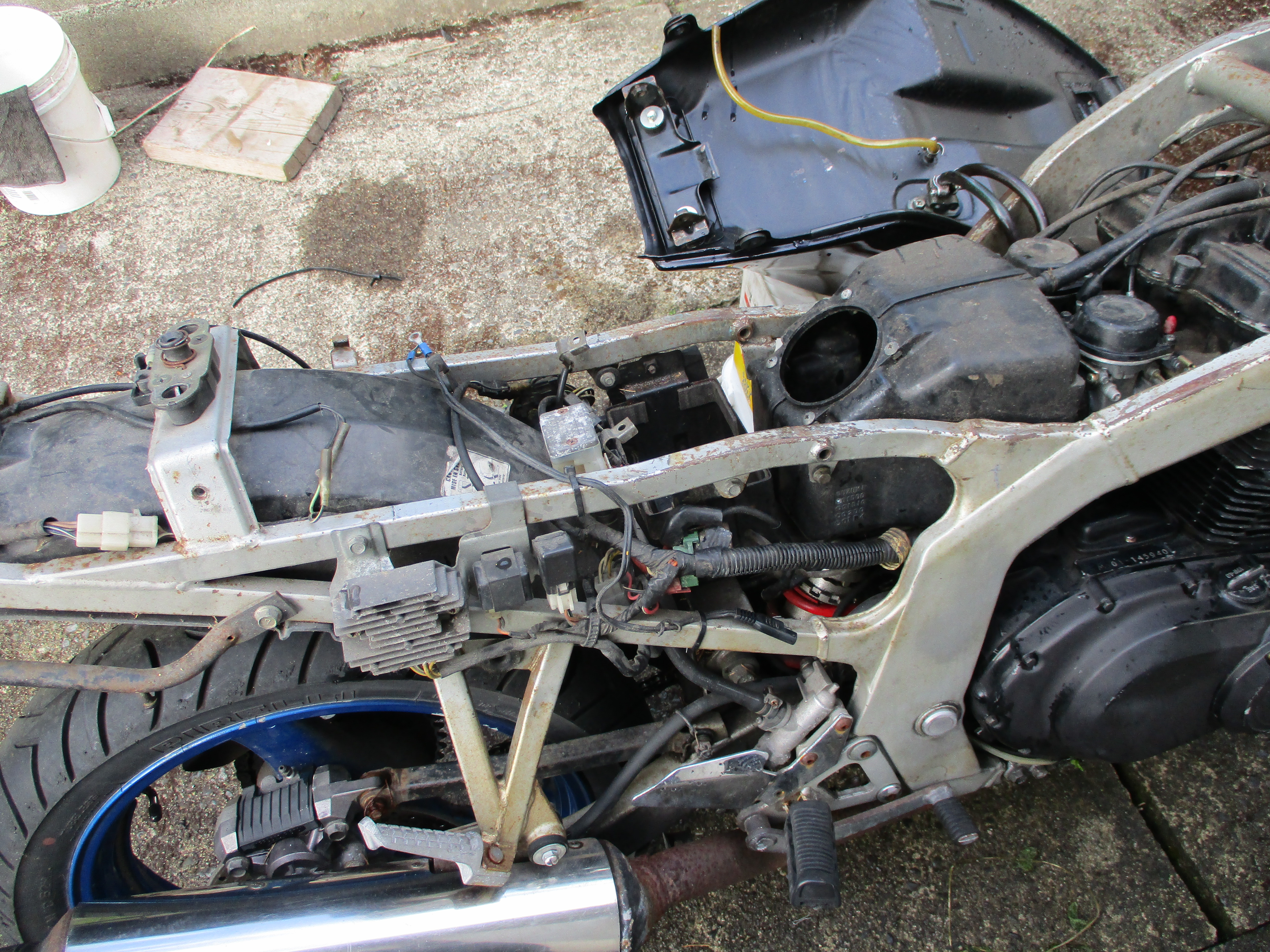 Next I removed the engine, front wheel and forks. Then the bottom triple tree/steering stem and then the entire headlight/gauge top triple tree assembly with the main wiring harness still connected to it. And then the rear wheel, swingarm, and rear suspension.