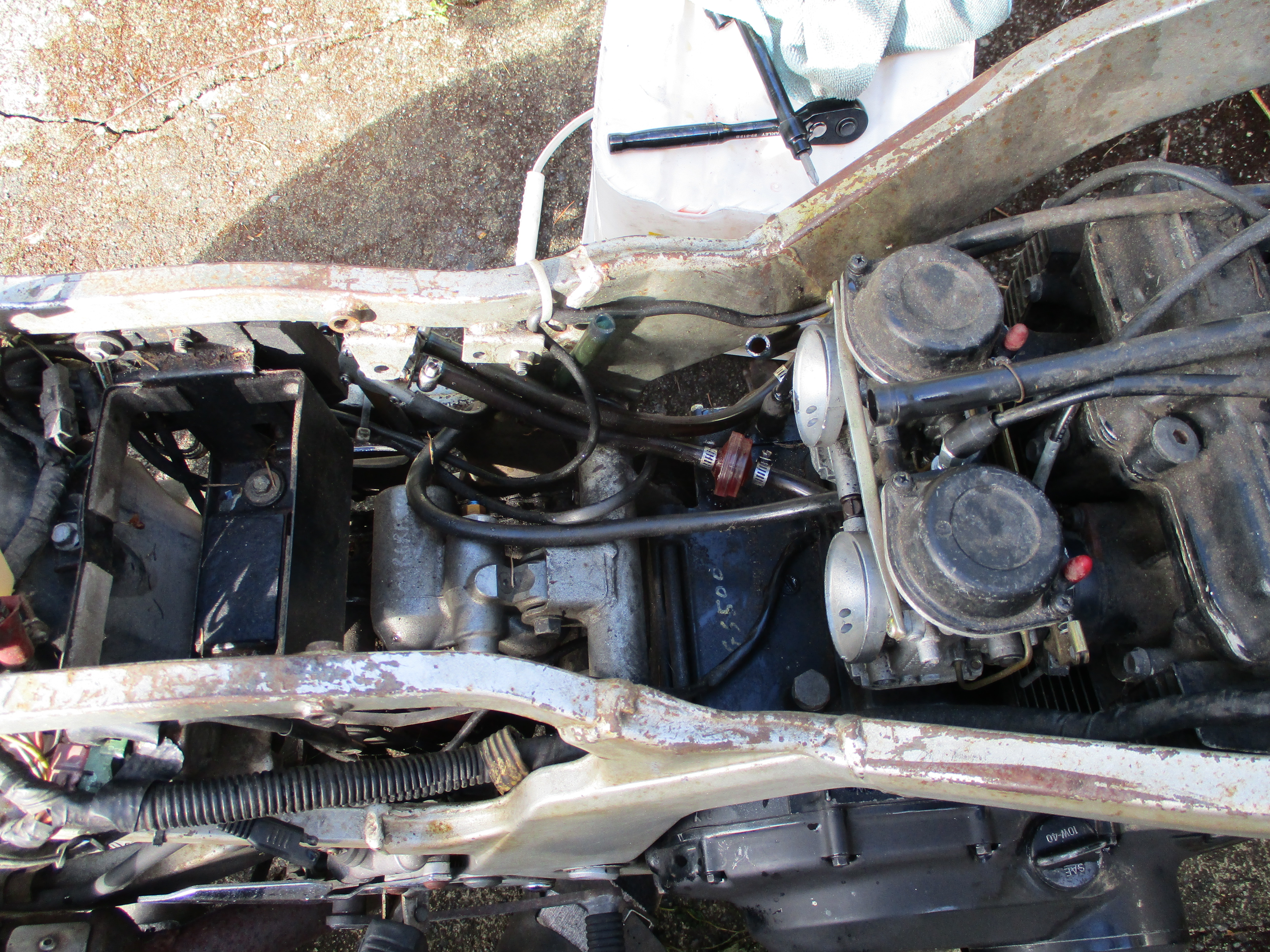 The entire motorcycle needed to come apart as the frame needed painting and everything needed inspecting. I removed the seat, fairings, and gas tank first.