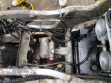Take a look at those fuel lines below and to the left of the carburetors. Those were originally clear hoses but now contained some sort of dark liquid. I am almost positive those are not fuel rated hoses either. Also note the red liquid inside the inline fuel filter.
