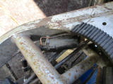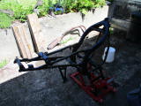 The frame was in good shape although a little rusty. After removing the steering bearings with the special tool (rebar punch) and gorilla taping the VIN tag I drove it to the local do it yourself sand blasing place. Sand blasting a motorcycle frame is difficult as it has many tubes, sides, mounting extrusions, and is awkward to move.