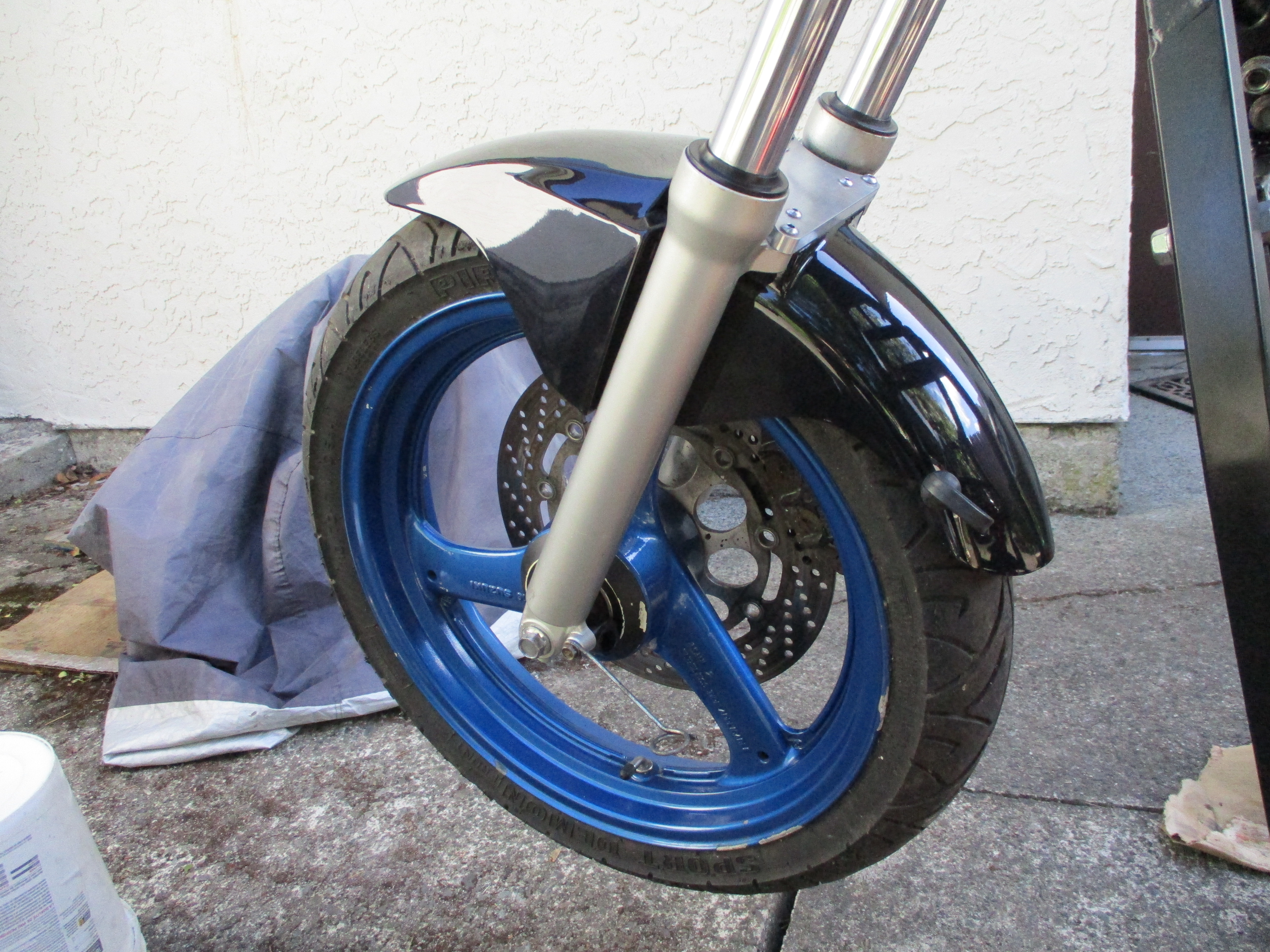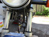 The front forks were slightly pitted in the non critical area that is not swept by the fork seals. I cleaned and polished that up best I could but the rust will be back. I painted the outermost fork legs then drained and replaced the old fork oil with new BelRay 10 weight.
