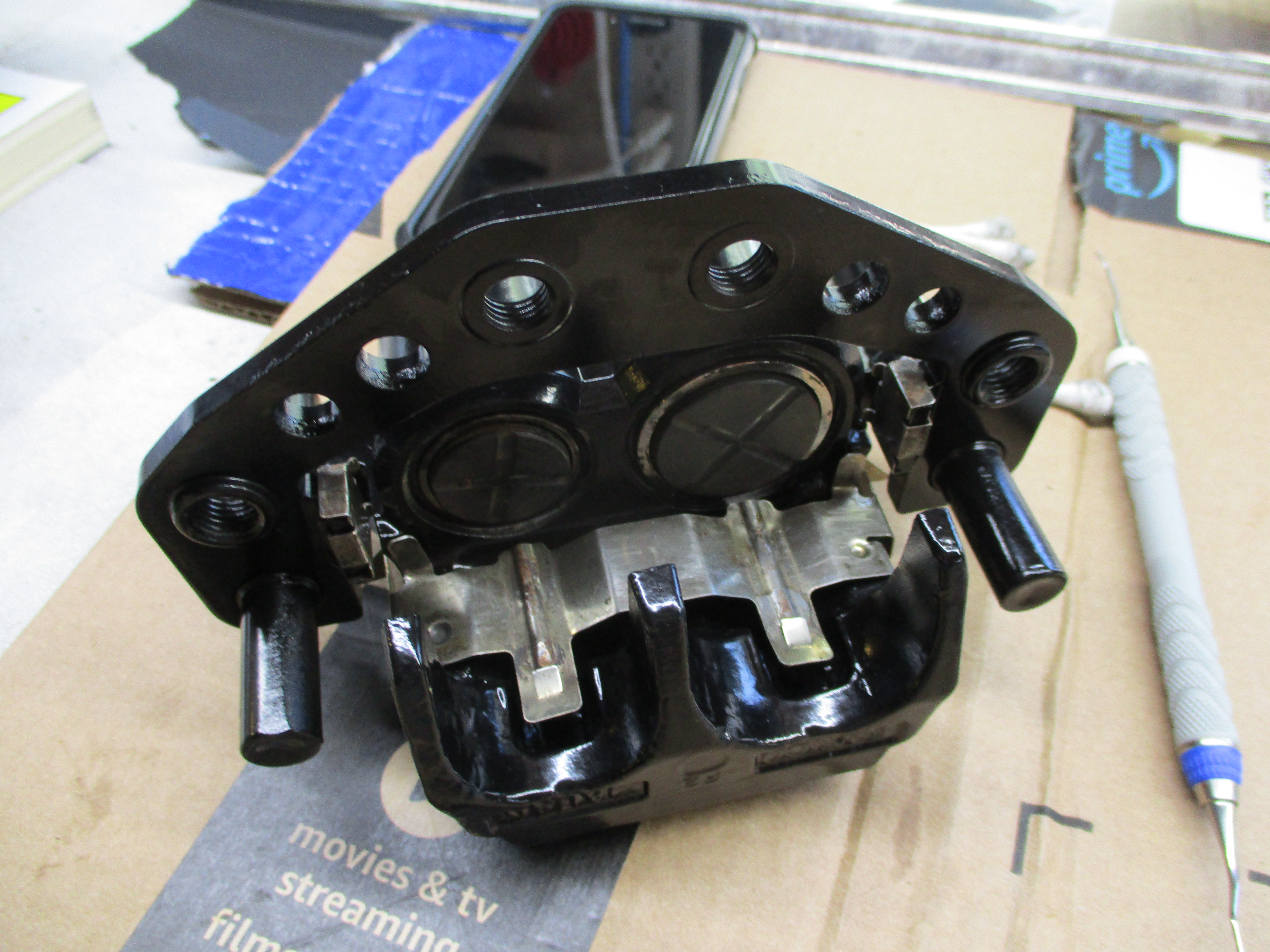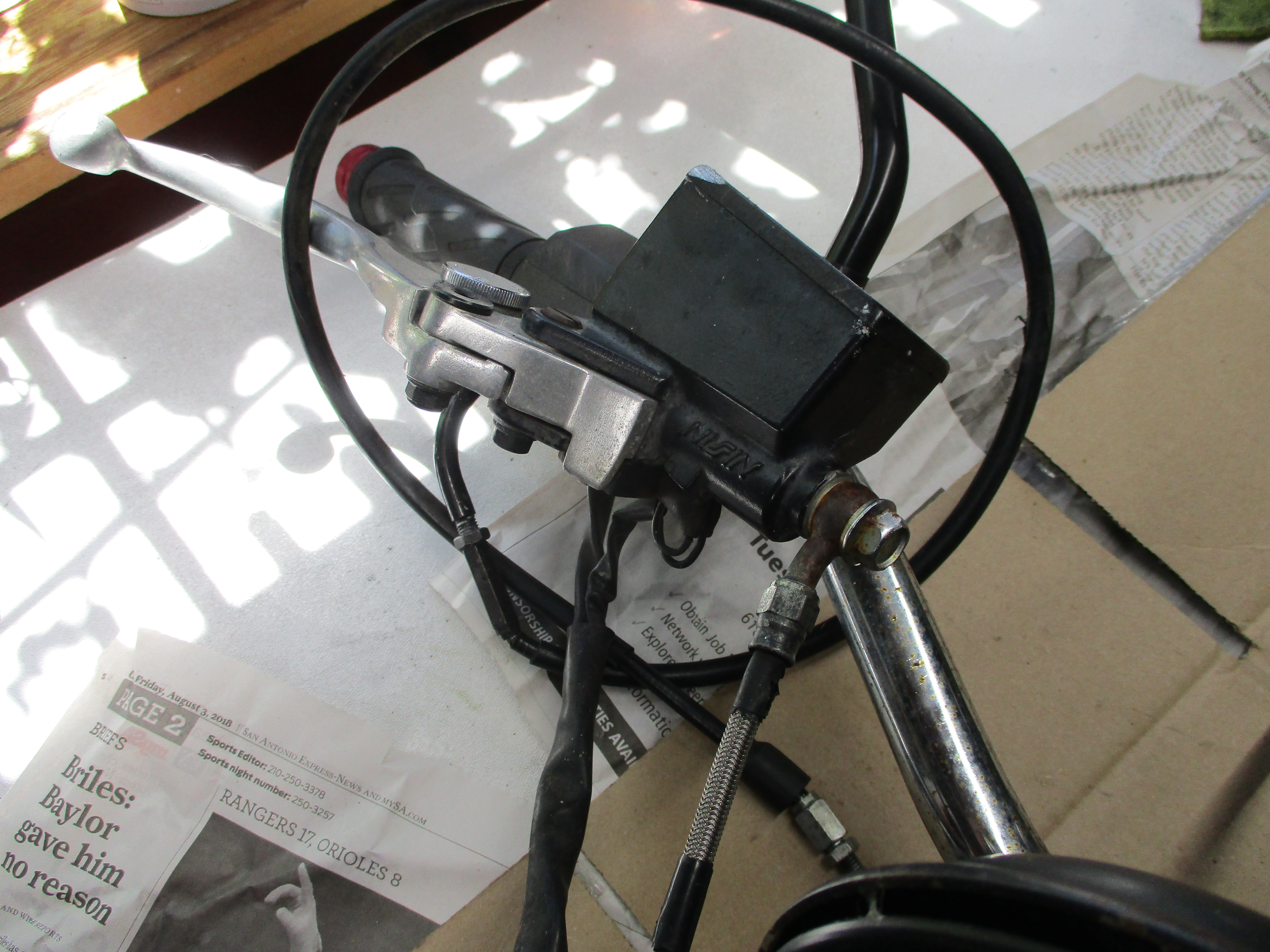 I bead blasted and painted the master cylinder and caliper with caliper paint (aka chemically resistant). I bought and installed All Balls rebuild kits for both of them, and bought and installed a new sight glass for the master cylinder. I had a new brake hose made locally that was slightly longer than the last one. I polished the caliper pistons before reinstalling them. And finally new DOT4 brake fluid for the entire system.