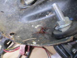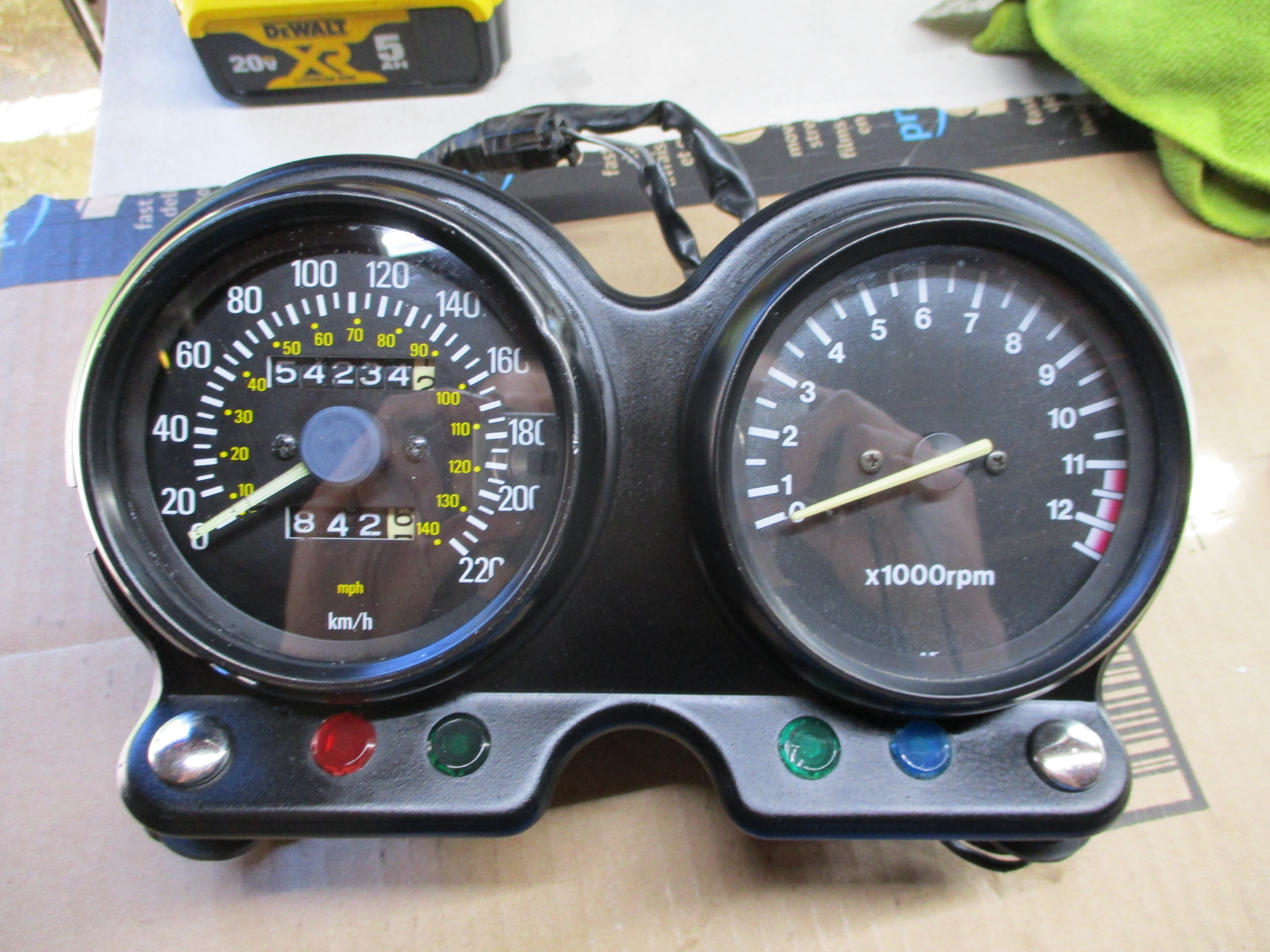 Taking apart the gauge cluster revealed a large resident spider which really surprised me. The speedometer gauge had been badly repaired and I needed to reattach the protective front lens. Someone had put an LED replacement bulb in the turn signal indicator and that was messing with the relay, so I fixed that. The light tubes that the idiot lights shine through was rusty so I cleaned that up and painted them. The gauge mounting plate was rusty and chipping paint so that got sandblasted and painted too.