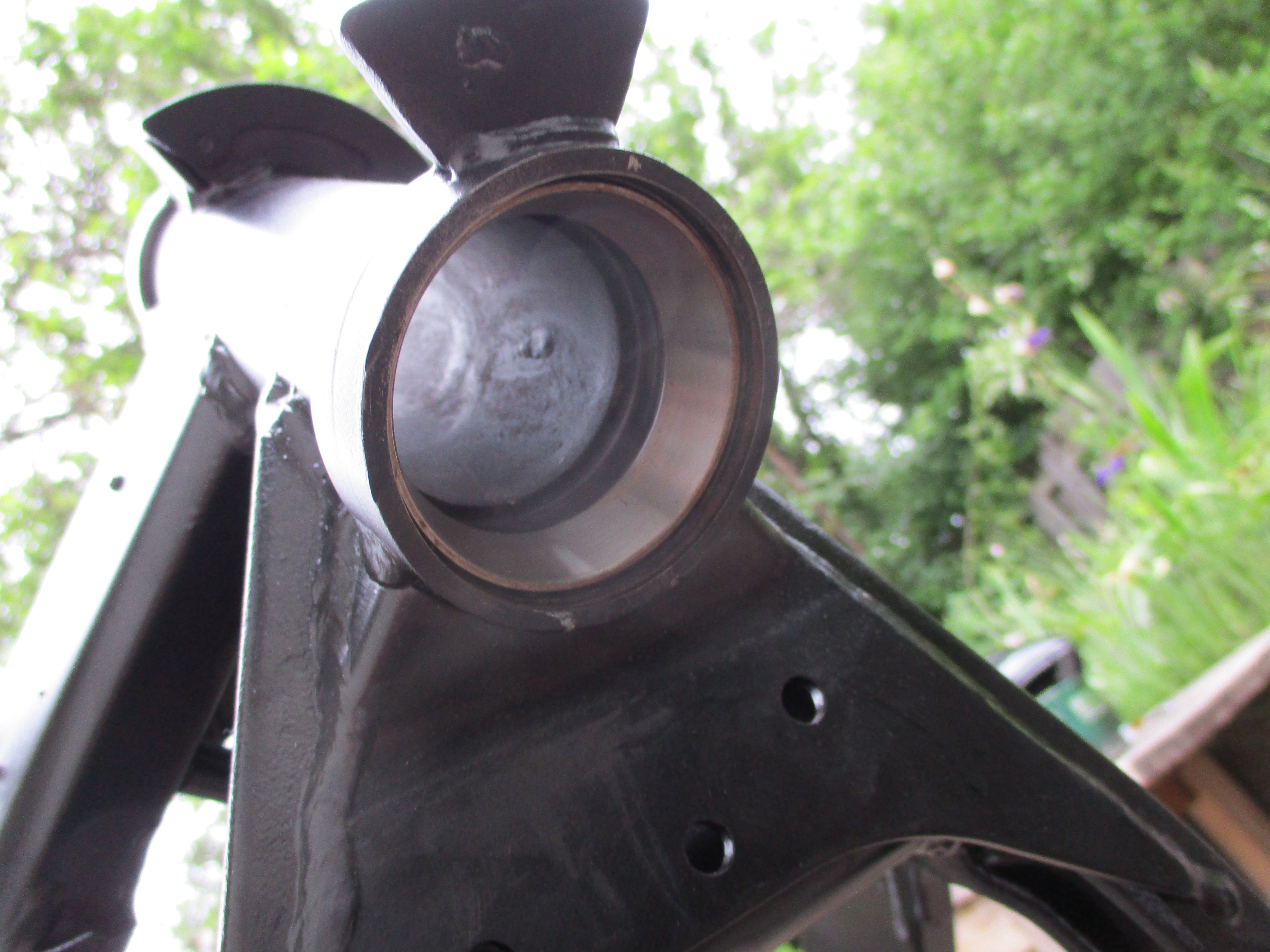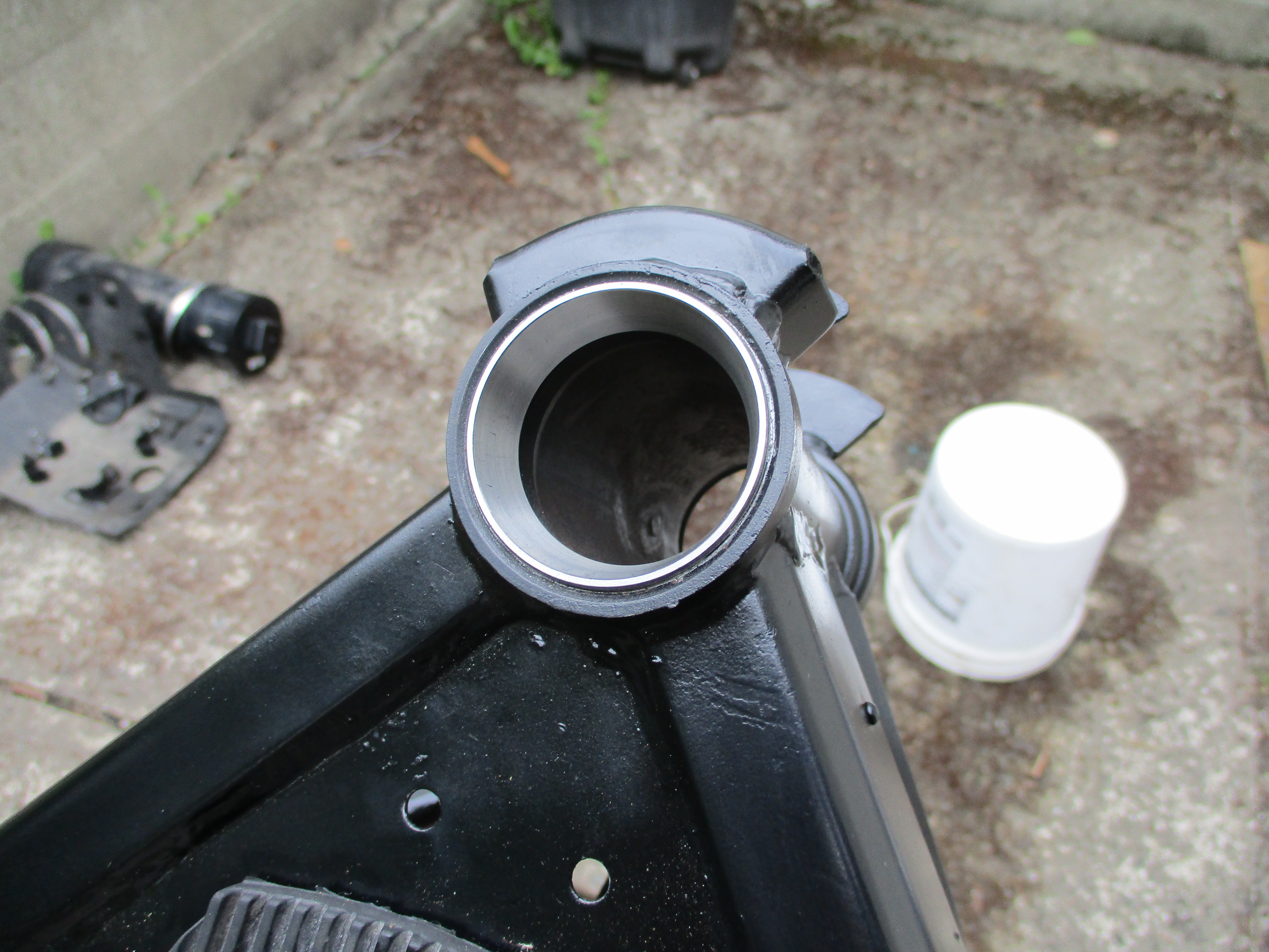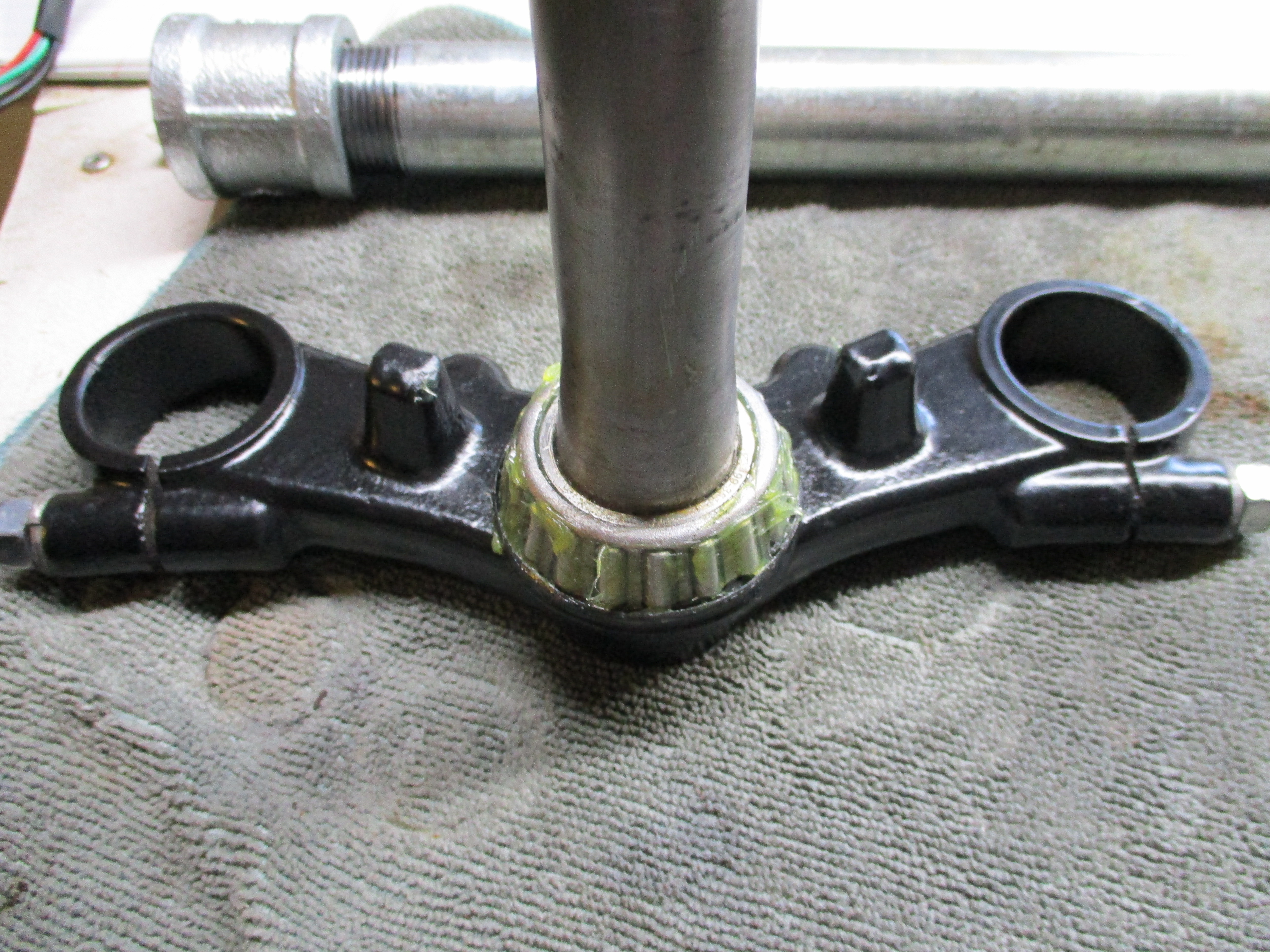 I cleaned up the steering stem by removing the old bearings and then sandblasting and painting it. I bought new All Balls bearings/races and installed them.