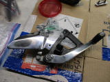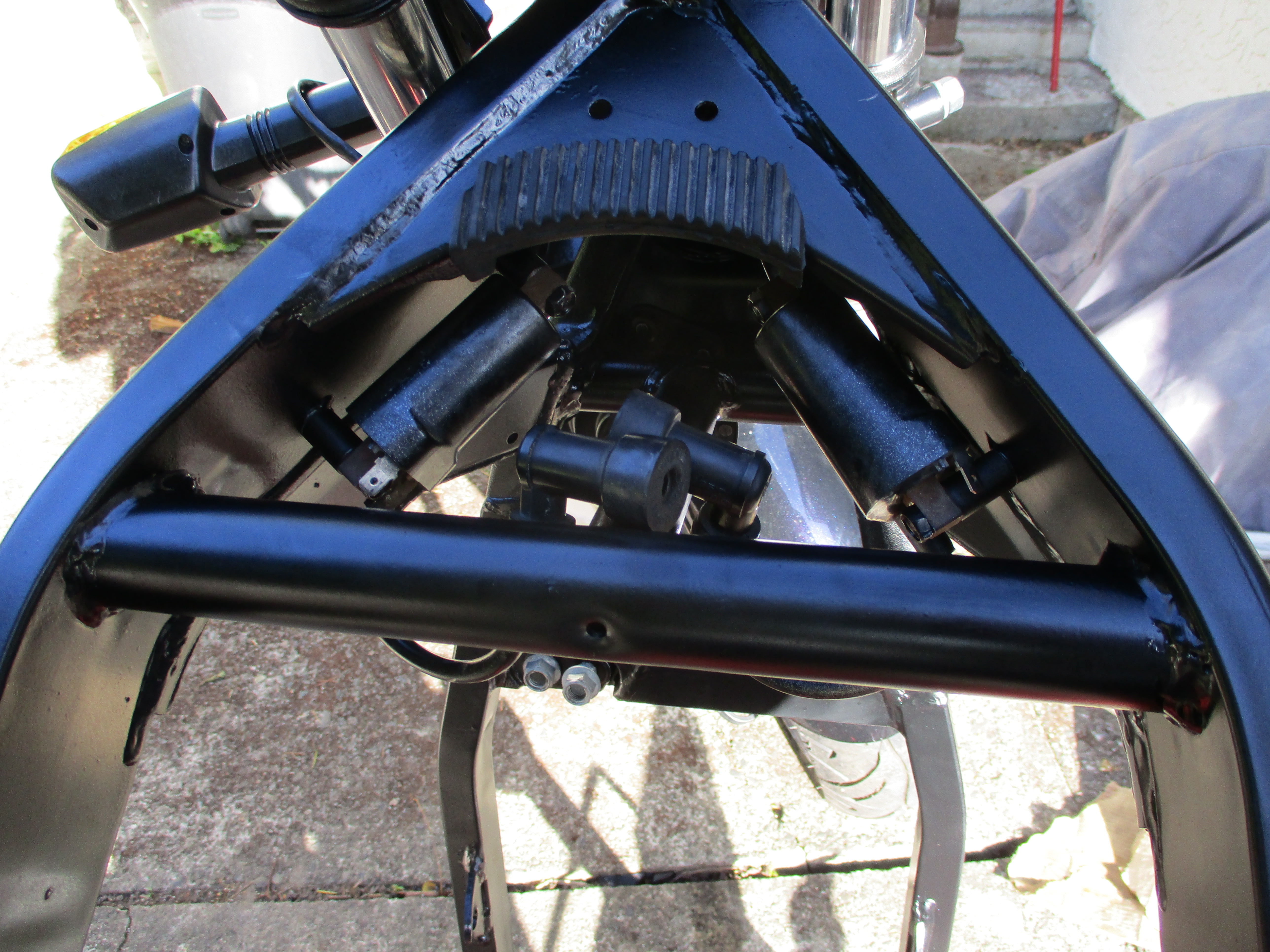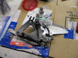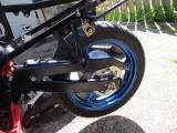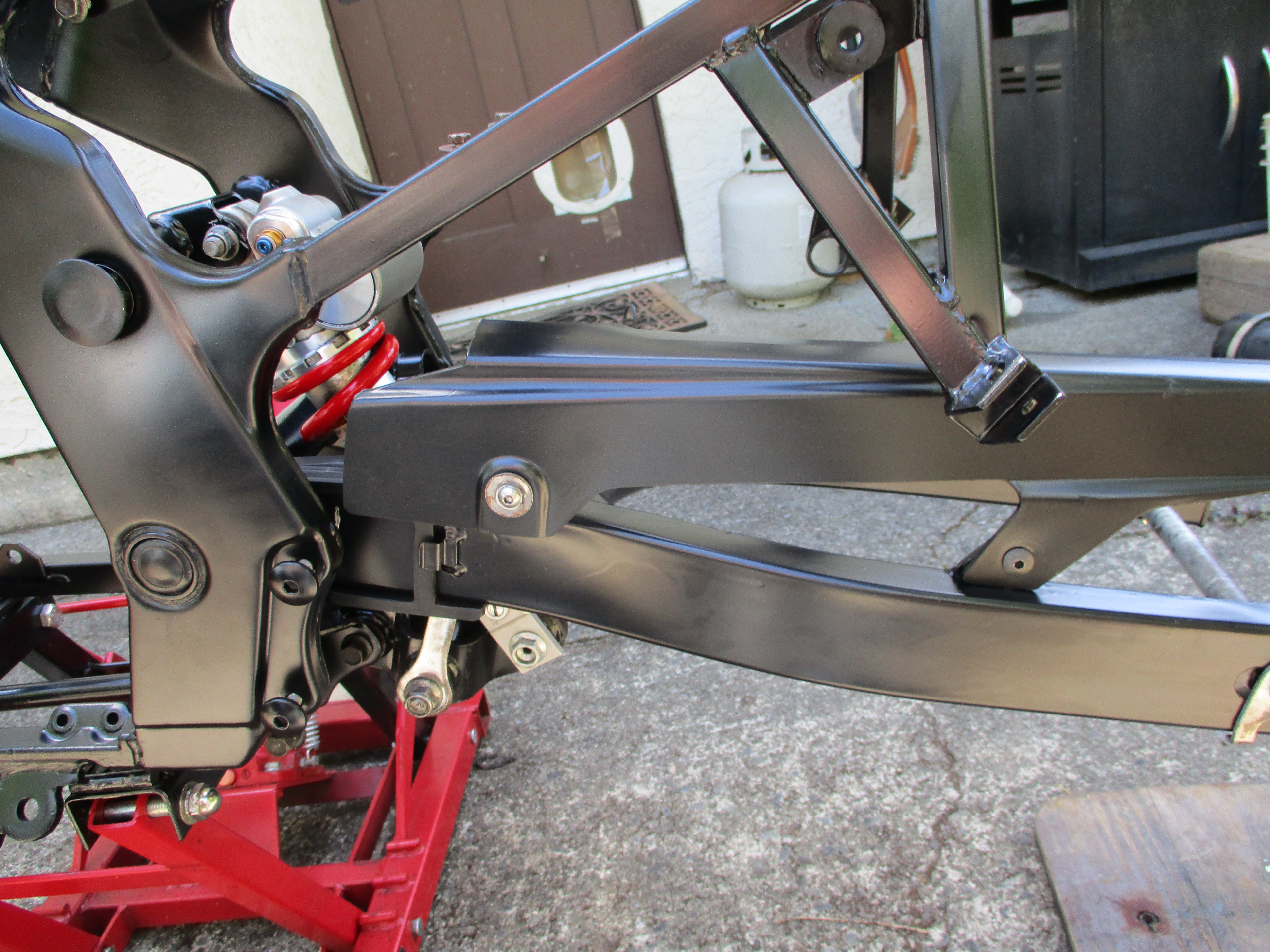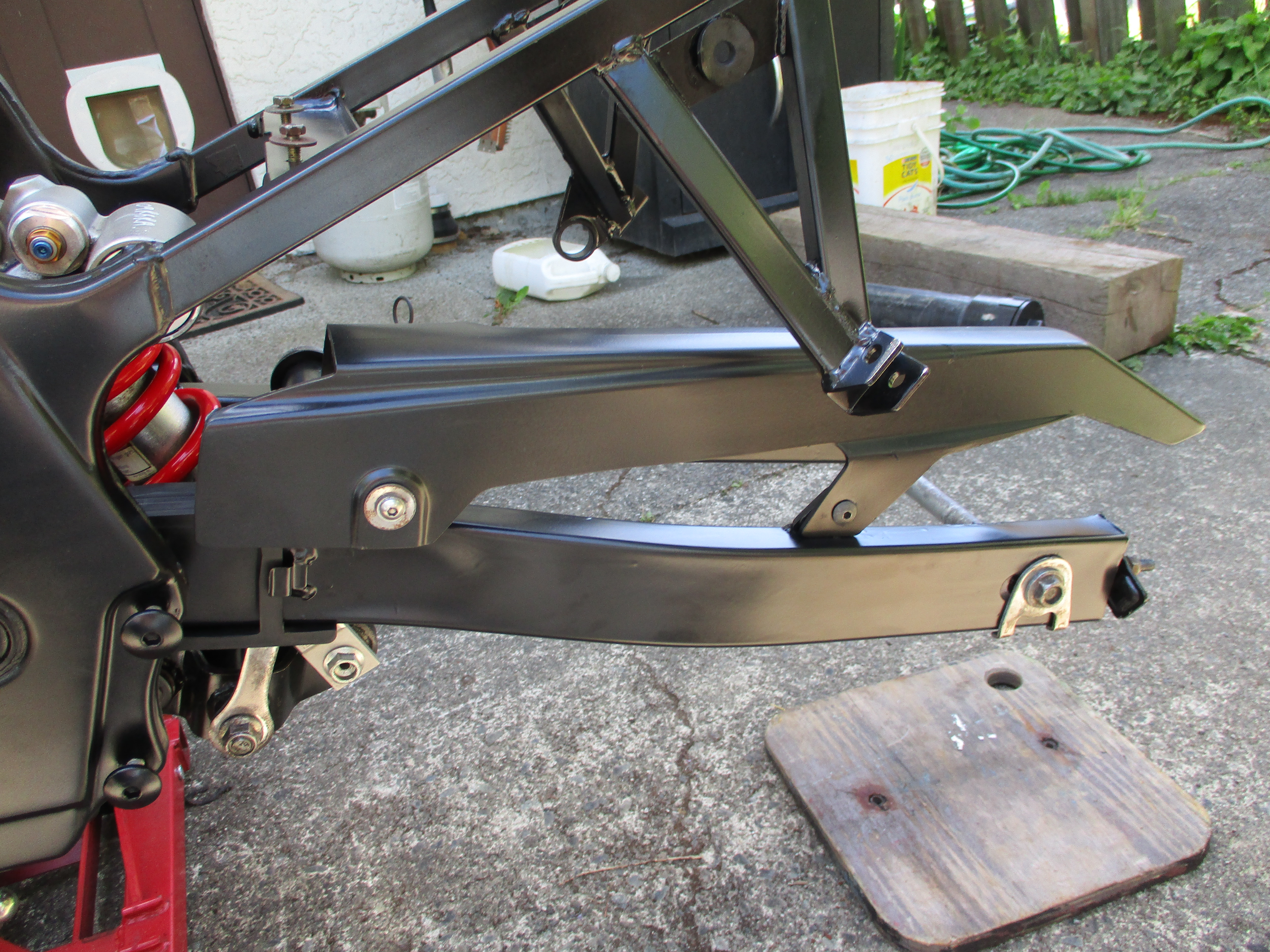 I cleaned up the swingarm by sandblasting and painting it. The needle bearings and sleeves inside looked brand new. A chain derailment at some point in the past had chewed it up pretty good on the left inside rail. The chain guard got painted with trim and bumper paint and I bought new fender washers for mounting it.
