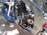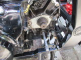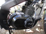 On the right side of the engine the clutch cover had been slid over something hard and ground part of the signal generator cover off, broke one of the mounting bosses, and taken off the decorative plate with the Suzuki logo on it. The Cooling fins on the cylinder are also scraped up and one is broken.