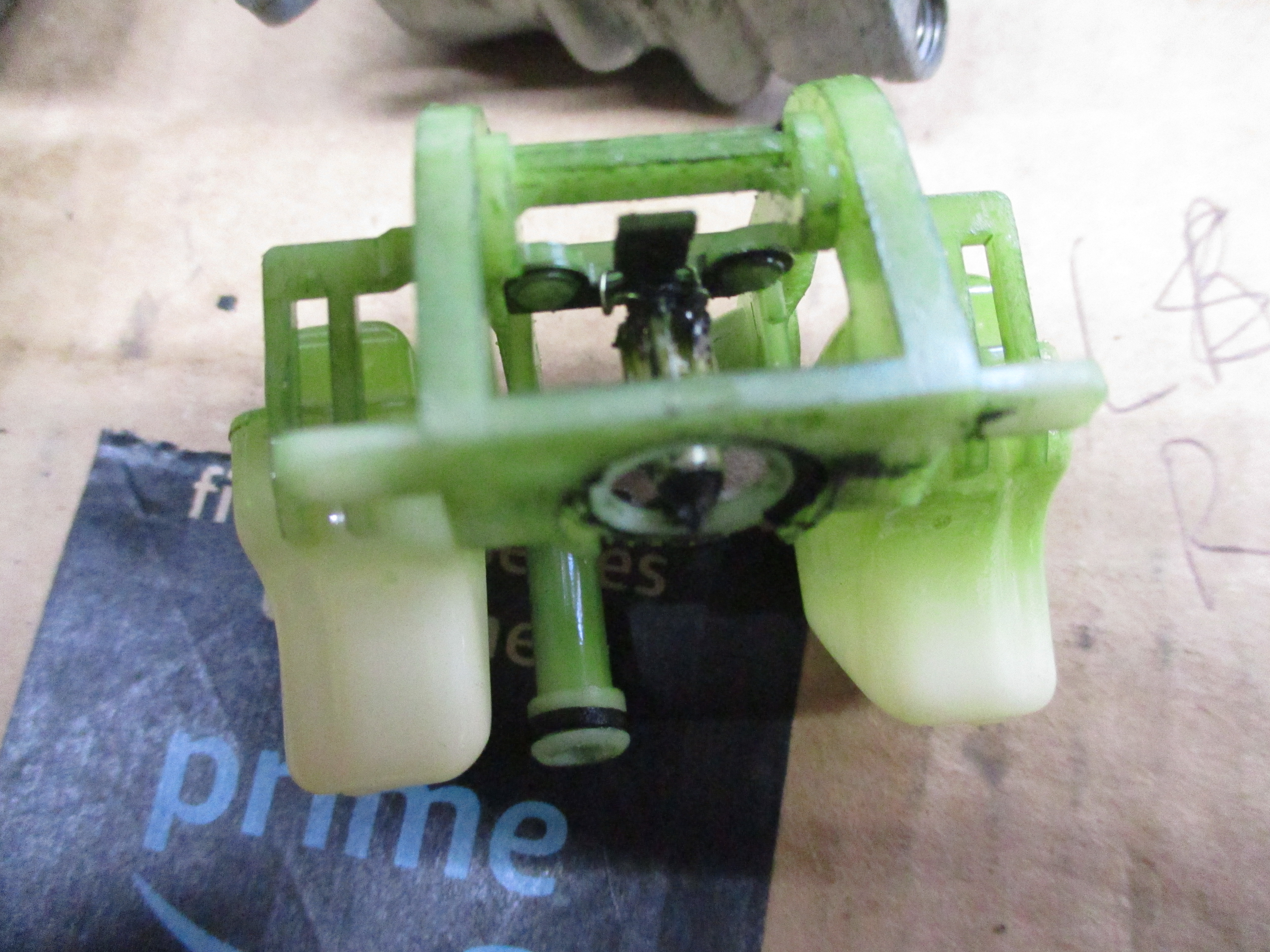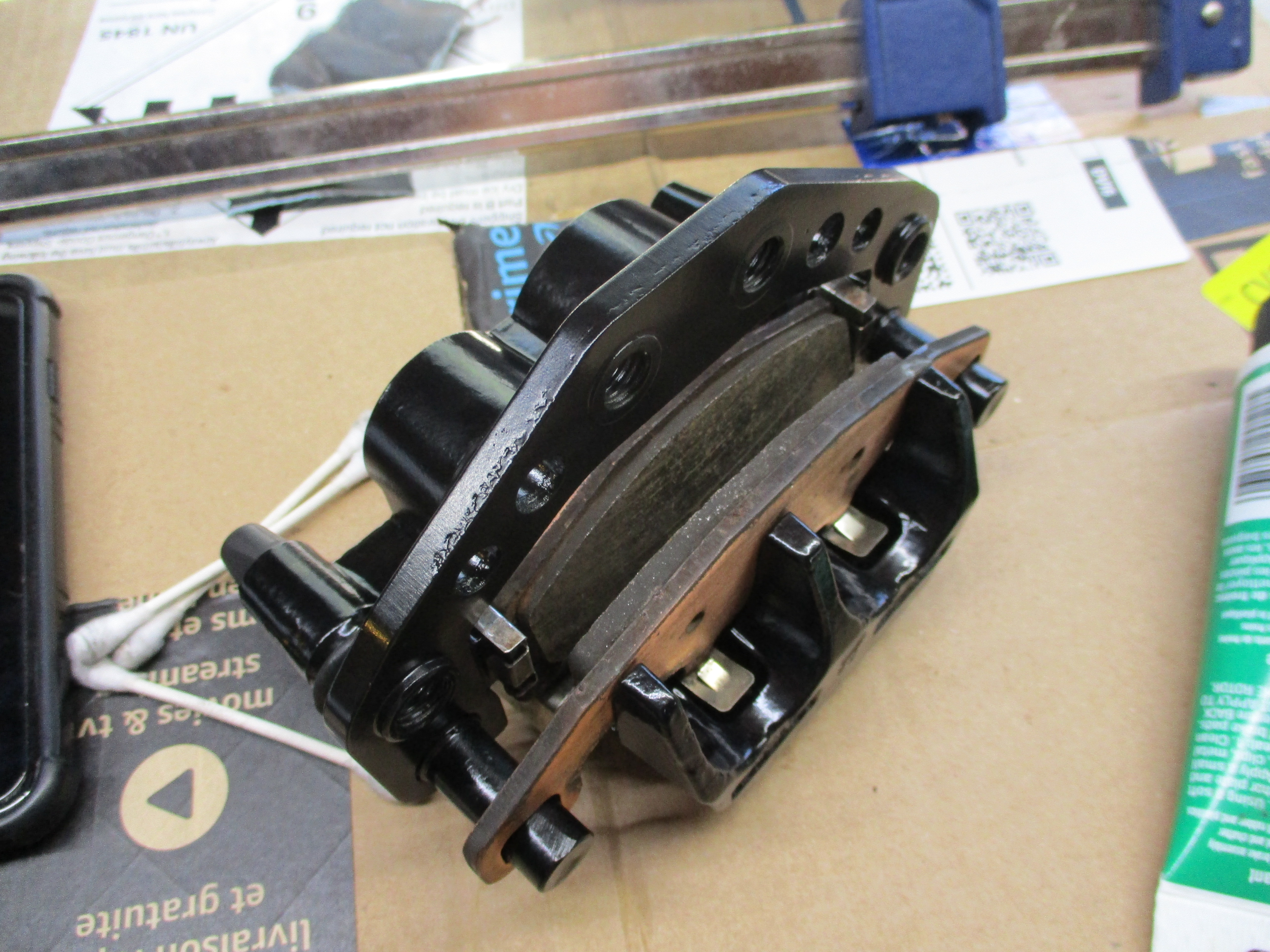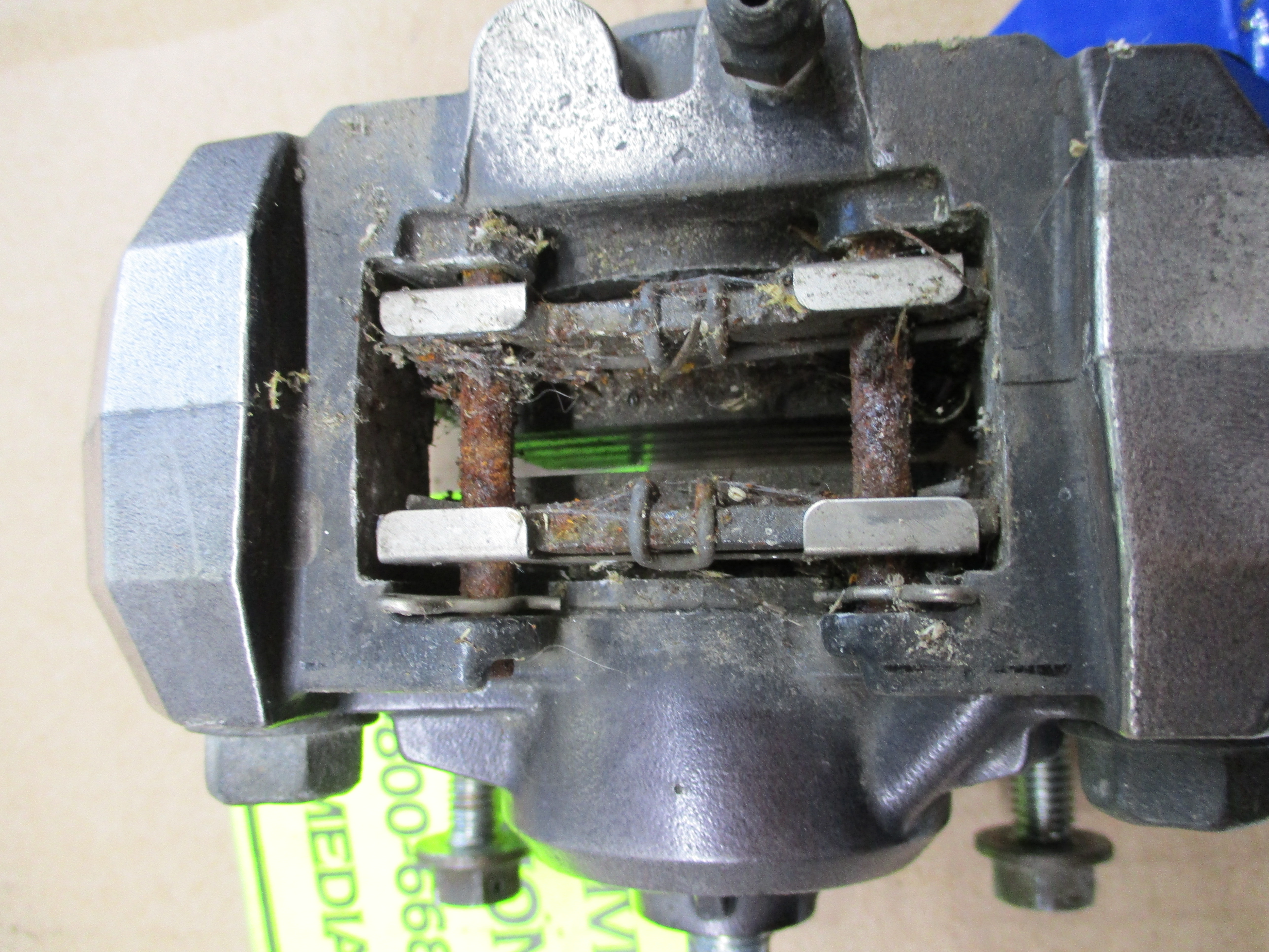 The rear brake hose looked melted from the exhaust but it still held fluid. The reservoir lid was corroded and the caliper paint was faded and brake pads and pins looked rusty. The bleed screw was rusty.