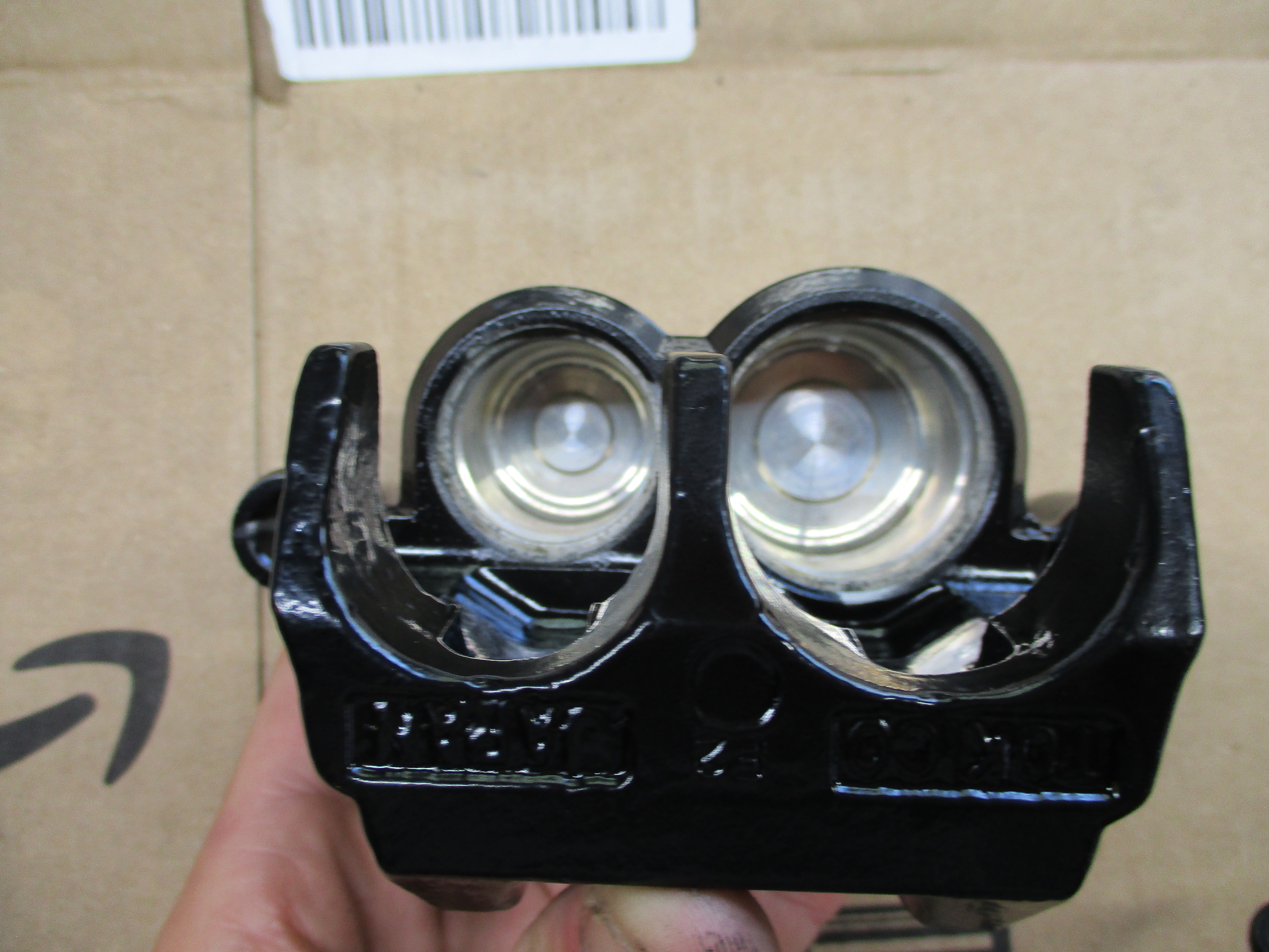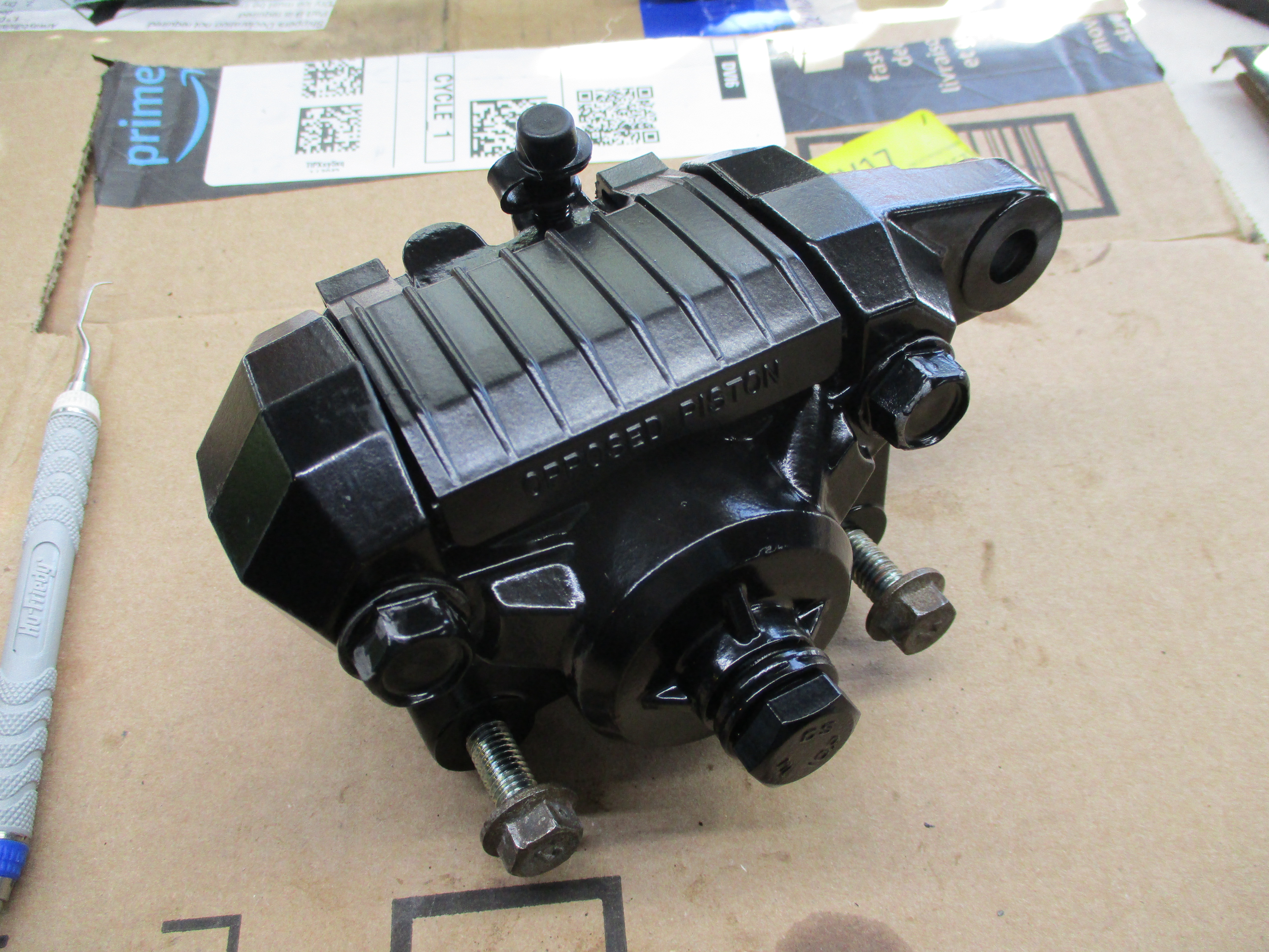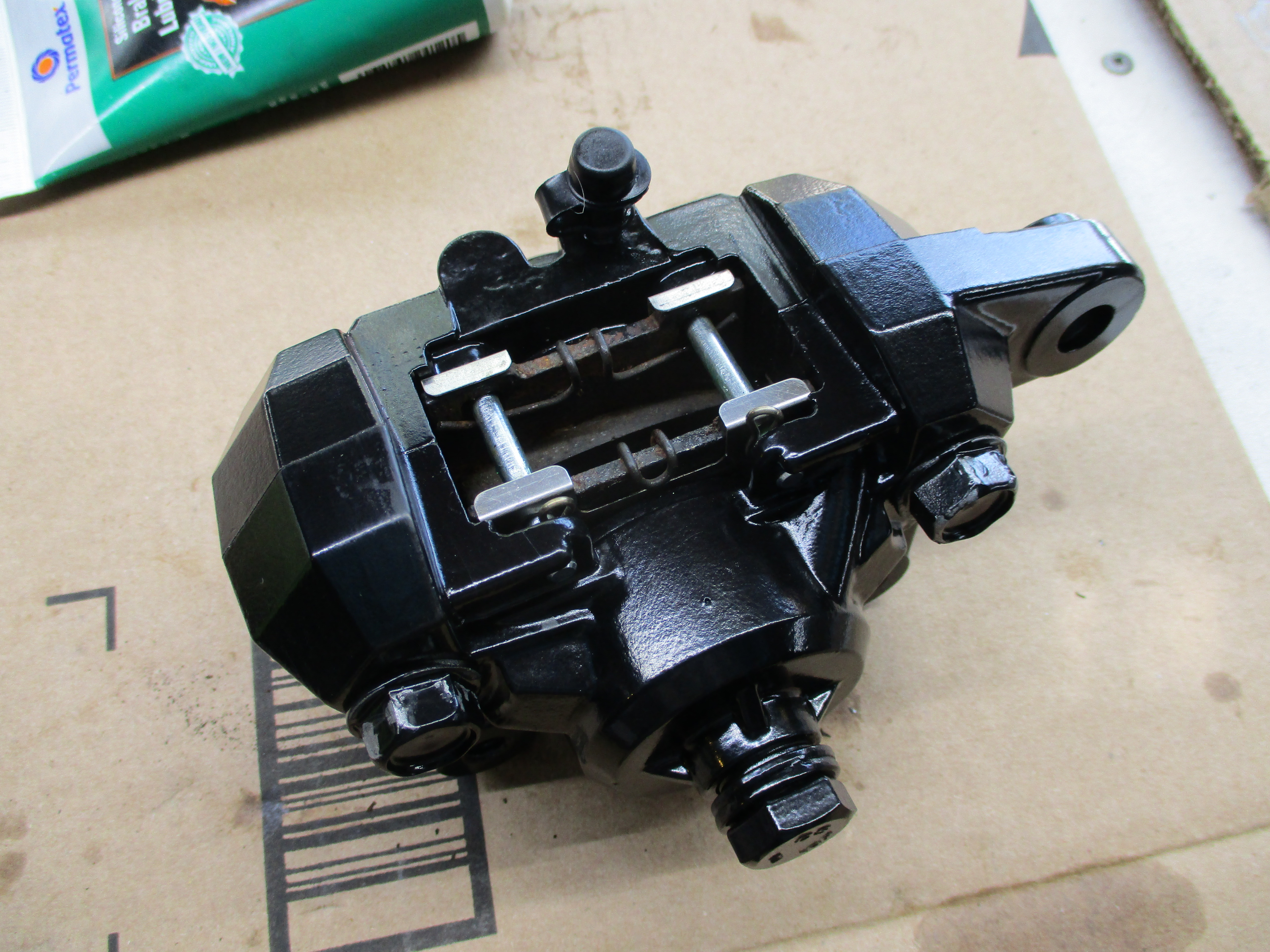 The front brake was very tight and it felt like the pistons did not want to retract back into the bore after activating them. The master cylinder sight glass was no longer transparent and the paint was faded and missing. The stainless front brake hose was too short for the application and looked crushed in one section. I had the hose tested at a local hydraulic shop and sure enough it had a pinhole leak (!). Always be careful with equipment you purchase. The caliper paint was faded and pistons were slightly corroded. The bleed screw was rusty.